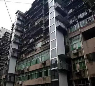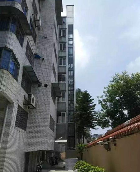 采用這種加裝方式大多是因為樓的南面需要過車等,這時候就可以考慮將電梯加裝在樓宇的陰面,徹底避免對采光和通風的影響。